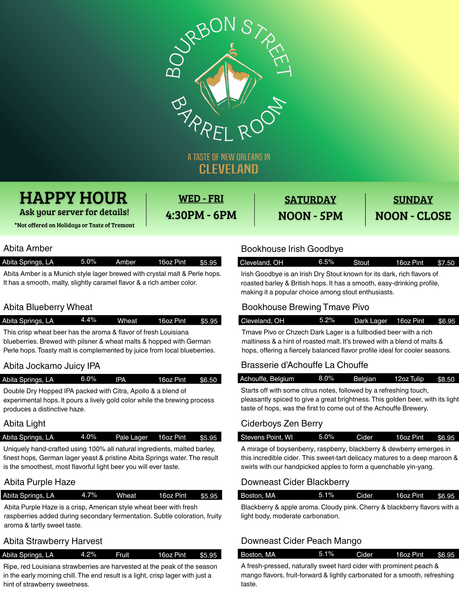 The Bourbon Street Barrel Room offers a relaxed, casual, fun atmosphere while serving authentic New Orleans cuisine by Southern Louisiana native, Johnny Schulze. Chef Johnny's Creole and Cajun-inspired menu includes classics such as: gumbo, jambalaya, crawfish etouffee & beignets (just to name a few). The Bourbon Street Barrel Room also features 30 rotating craft beer handles from some of the best breweries in the world, as well as ALL the classic New Orleans cocktails made with love and care. Located in the heart of the historic Tremont neighborhood on Professor Ave in Cleveland Ohio, BSBR features an open split-level room with bars on both floors creating an exciting guest experience! BSBR is also open for lunch on Saturdays and offers an authentic New Orleans Brunch on Sundays.