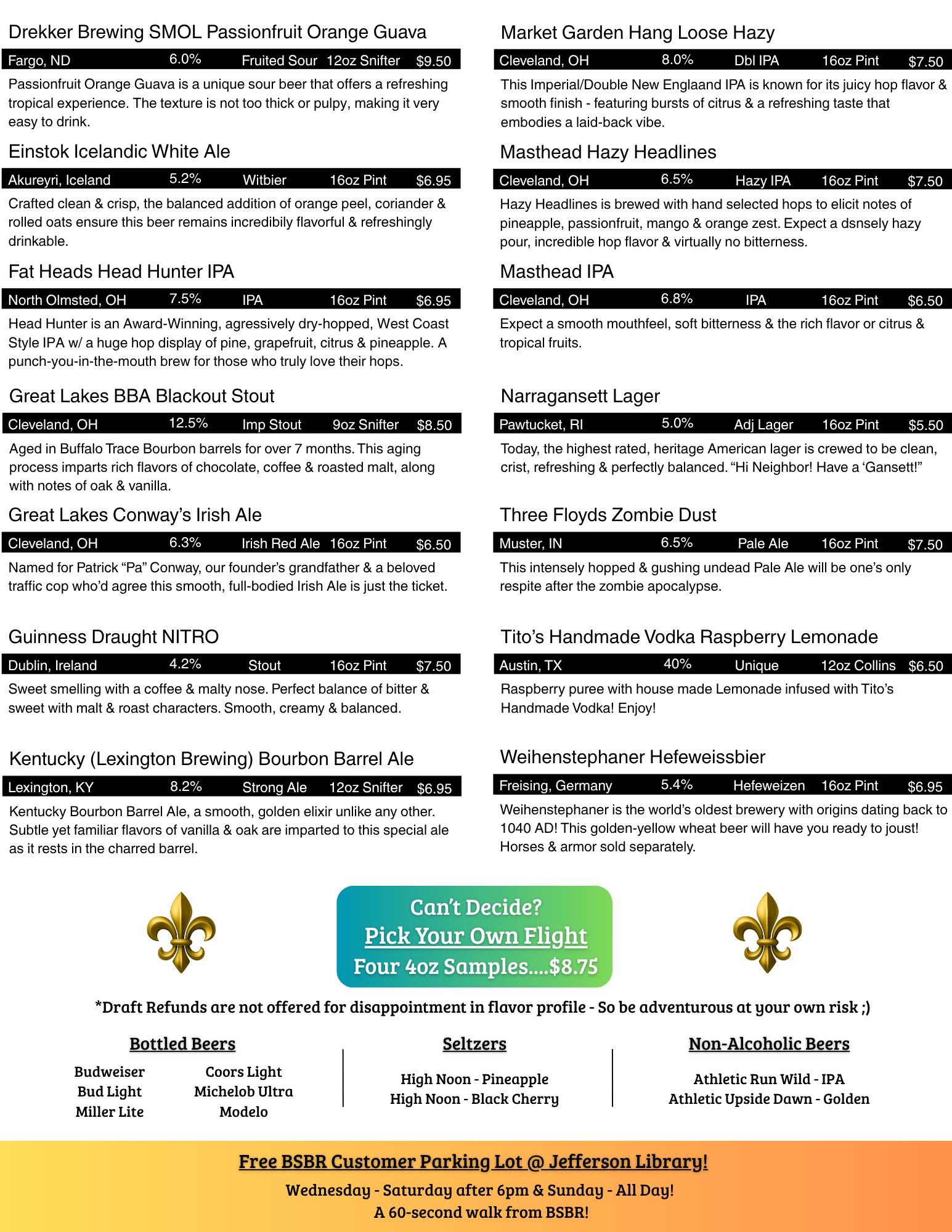 BSBR Features 30 Rotating Craft Beer Handles from some of the best breweries in Louisiana, Cleveland & around the world.