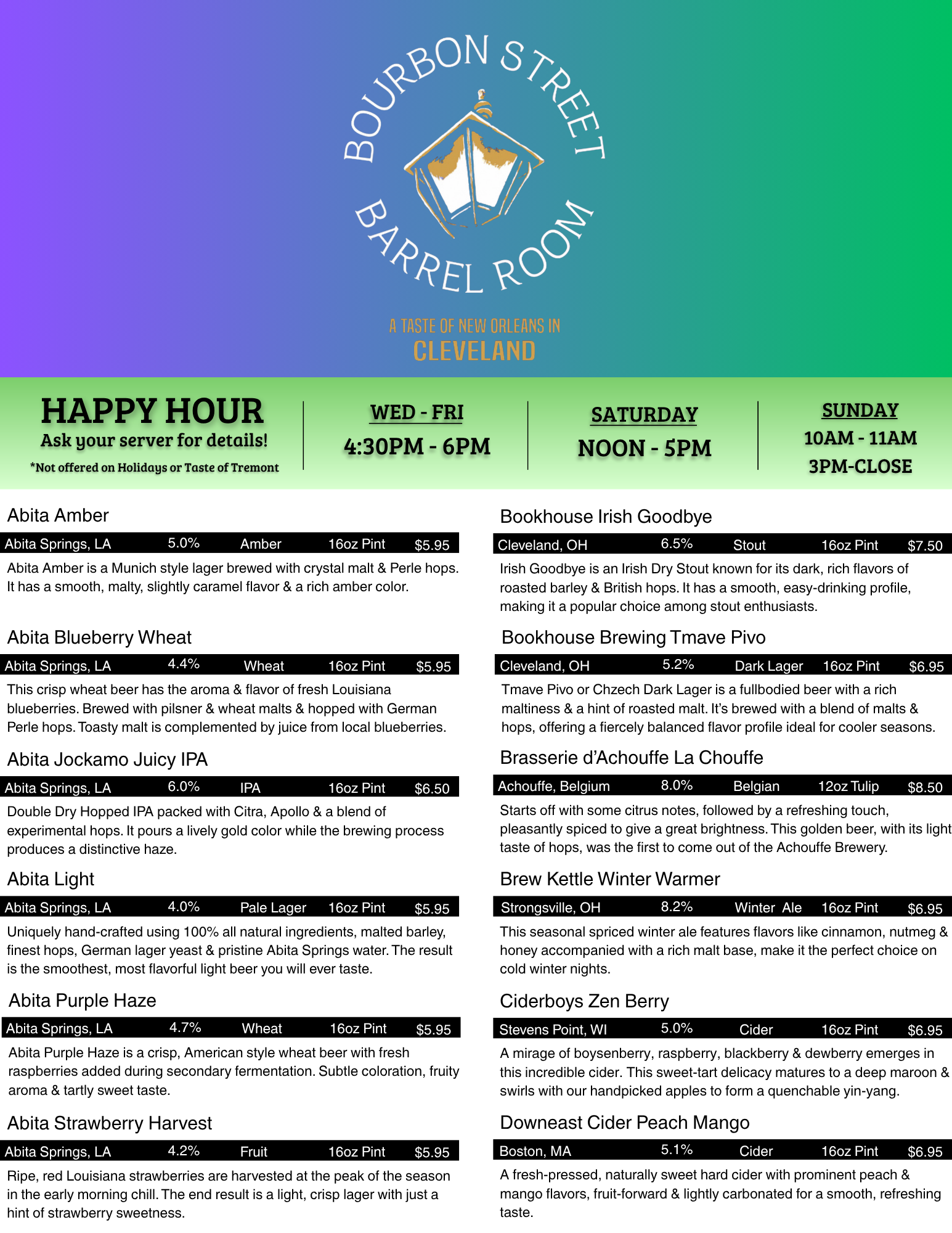 The Bourbon Street Barrel Room offers a relaxed, casual, fun atmosphere while serving authentic New Orleans cuisine by Southern Louisiana native, Johnny Schulze. Chef Johnny's Creole and Cajun-inspired menu includes classics such as: gumbo, jambalaya, crawfish etouffee & beignets (just to name a few). The Bourbon Street Barrel Room also features 30 rotating craft beer handles from some of the best breweries in the world, as well as ALL the classic New Orleans cocktails made with love and care. Located in the heart of the historic Tremont neighborhood on Professor Ave in Cleveland Ohio, BSBR features an open split-level room with bars on both floors creating an exciting guest experience! BSBR is also open for lunch on Saturdays and offers an authentic New Orleans Brunch on Sundays.