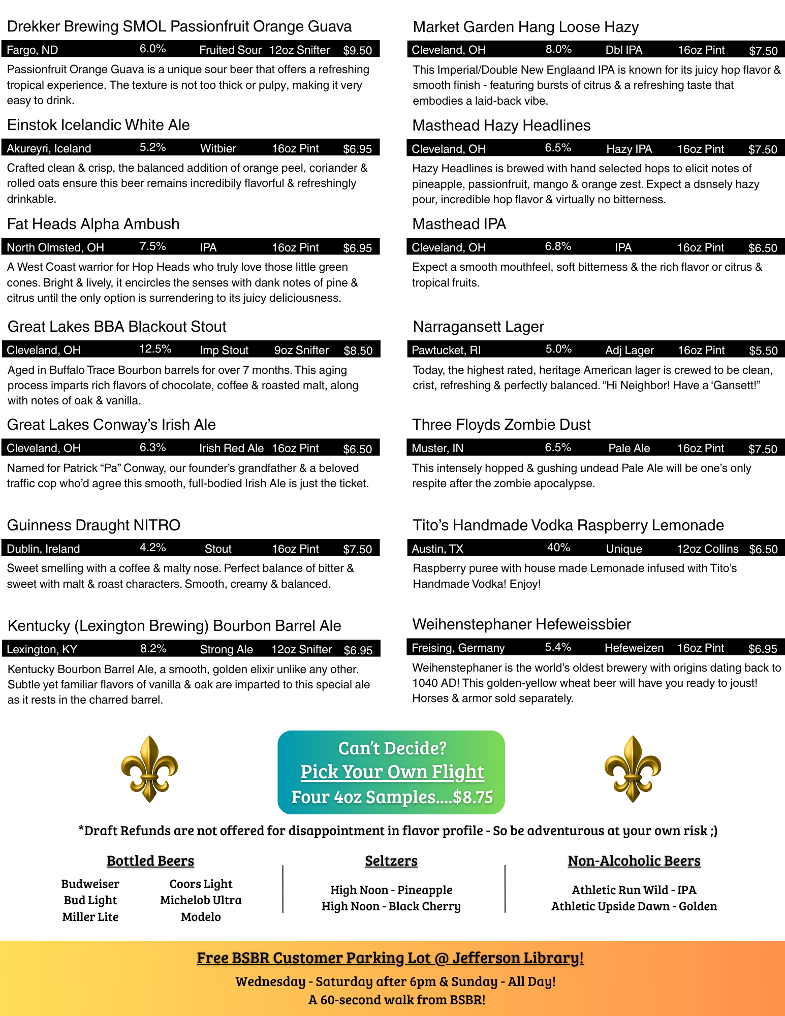 BSBR Features 30 Rotating Craft Beer Handles from some of the best breweries in Louisiana, Cleveland & around the world.